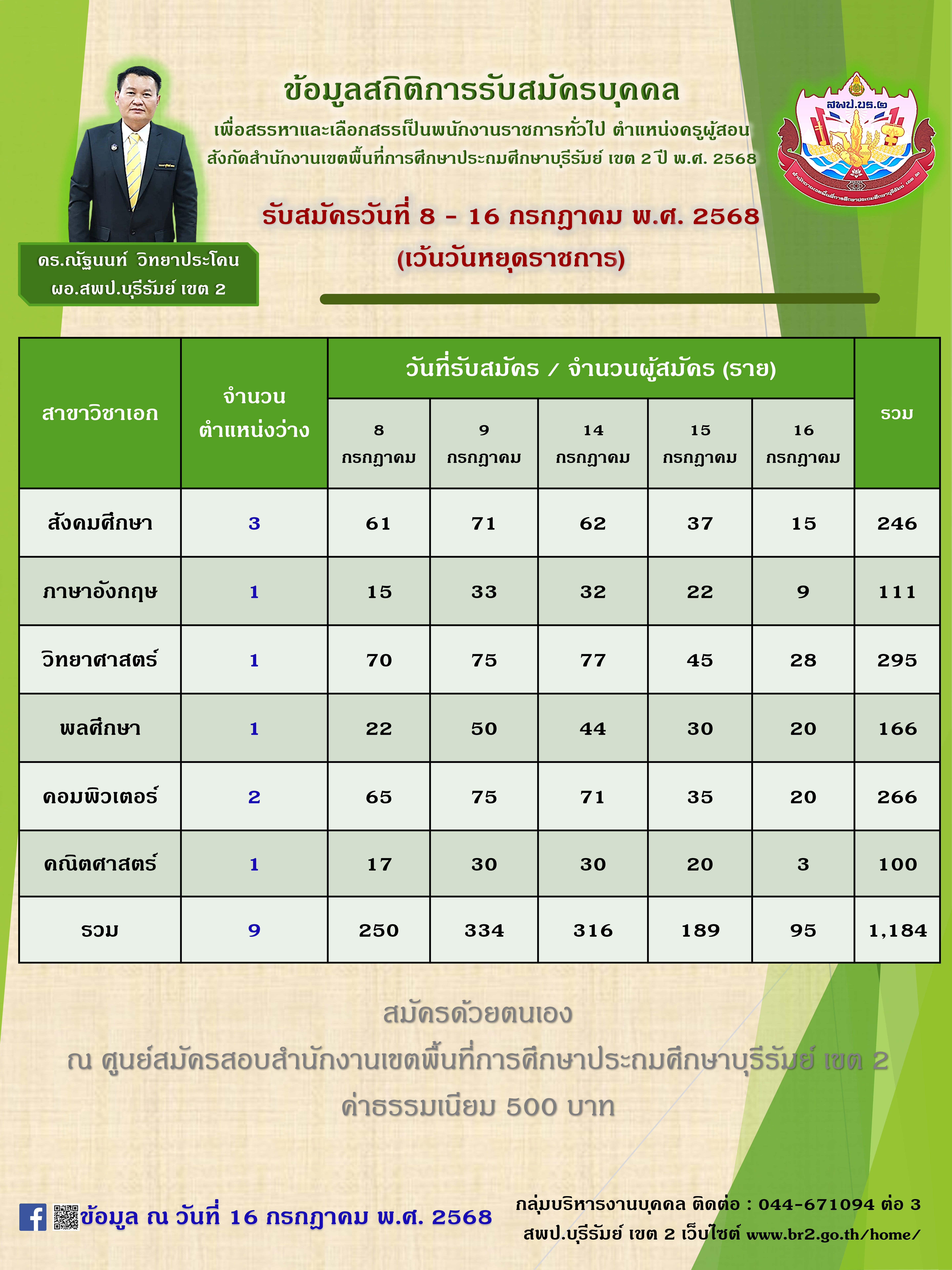 สถิติการรับสมัครบุคคลเพื่อสรรหาและเลือกสรรเป็นพนักงานราชการทั่วไป ตำแหน่งครูผู้สอน สังกัด สพป.บุรีรัมย์ เขต 2 ประจำวันที่ 16 กรกฎาคม 2568