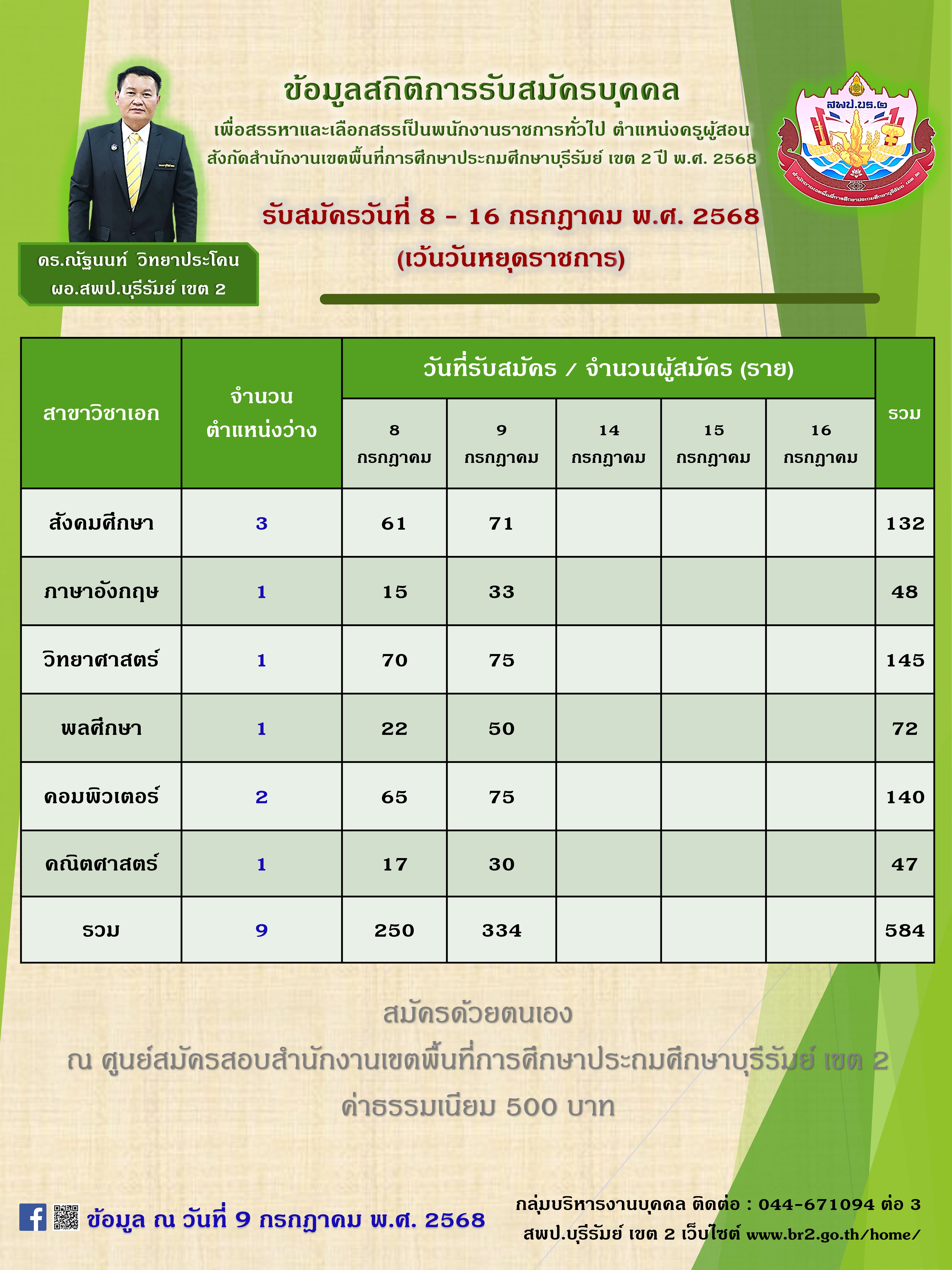 สถิติการรับสมัครบุคคลเพื่อสรรหาและเลือกสรรเป็นพนักงานราชการทั่วไป ตำแหน่งครูผู้สอน สังกัด สพป.บุรีรัมย์ เขต 2 ประจำวันที่ 9 กรกฎาคม 2568