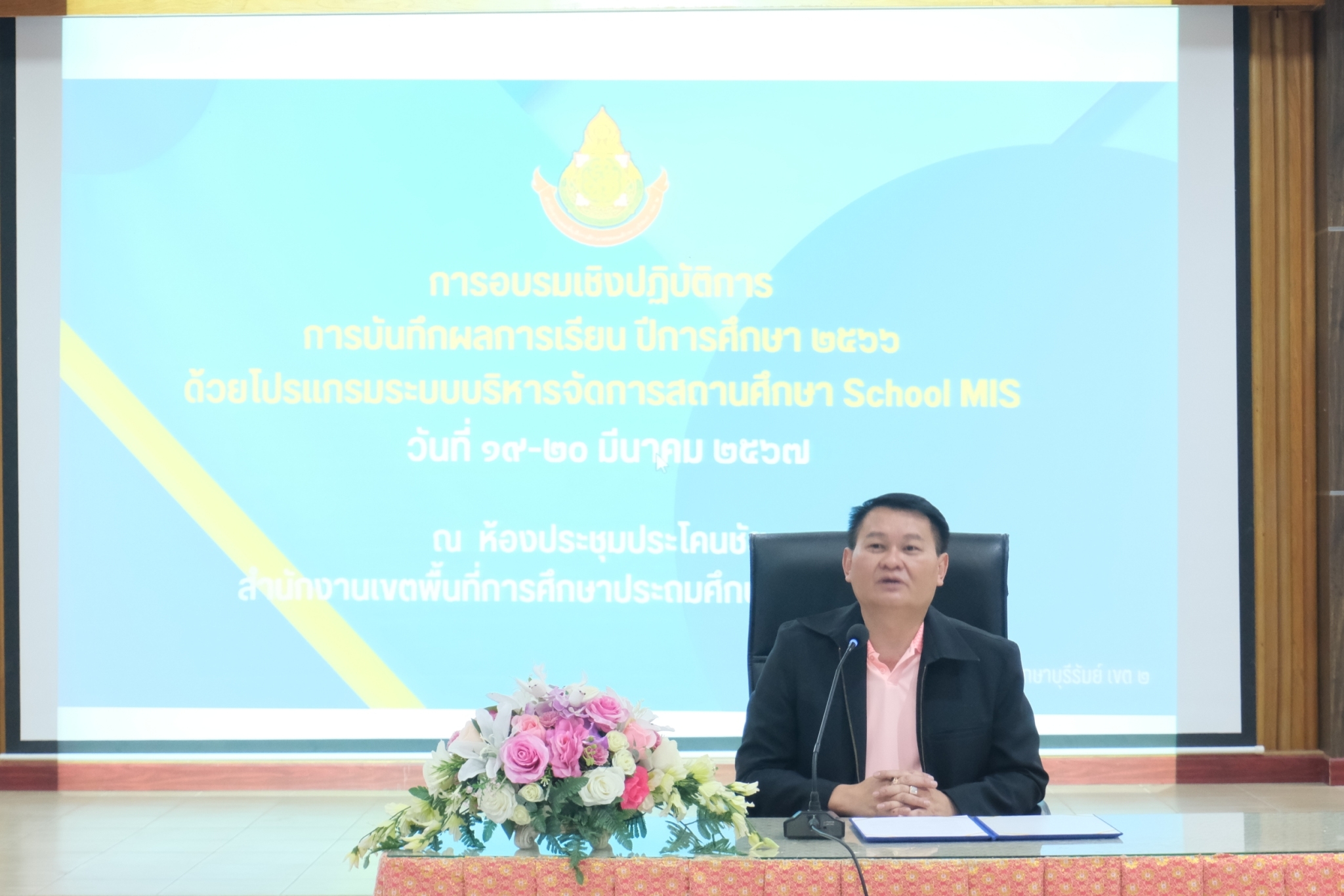 วันที่ 19 มีนาคม 2567 ดร.ณัฐนนท์ วิทยาประโคน ผู้อำนวยการสำนักงานเขตพื้นที่การศึกษาประถมศึกษา บุรีรัมย์ เขต 2 มอบหมายให้ นางประภัสสร บุญสมัย รองผู้อำนวยการสำนักงานเขตพื้นที่การศึกษาประถมศึกษาบุรีรัมย์ เขต 2 เป็นประธานในพิธีเปิดการอบรมเชิงปฏิบัติการการบันทึกผลการเรียน ปีการศึกษา 2566 ด้วยโปรแกรมระบบบริหารจัดการสถานศึกษา School MIS ณ ห้องประชุมประโคนชัย สำนักงานเขตพื้นที่การศึกษาประถมศึกษาบุรีรัมย์ เขต 2 กล่าวรายงานโดย นายสาคร แขนรัมย์ ผู้อำนวยการกลุ่มงานนิเทศติดตามและประเมินผลการจัดการศึกษา โดยมีวิทยากร ได้แก่ 1. นายพิชิต พวงประโคน ผู้อำนวยการโรงเรียนบ้านโคกกี่ 2. นายดุสิต มังประโคน ครู โรงเรียนวัดบ้านเมืองต่ำ 3. นายนวศาสตร์ เพชรโรจน์ ครู โรงเรียนอนุบาลประโคนชัย (อำนวยกิจราษฎร์วิทยาคาร) 4. นางสาวศรินทร์ กาญจนพิมาย ครู โรงเรียนบ้านมะขามทานตะวัน 5. นางธิติมา โคตรชมพู และ 6. นางโศภรี วงศ์พรหมศิลป์ กลุ่มเป้าหมาย เป็นครูวัดผลของโรงเรียนจำนวน 228 โรงเรียน การอบรมแบ่งเป็น 3 รุ่น โดยรุ่นที่ 1 เป็นครูจากอำเภอประโคนชัย รุ่นที่ 2 เป็นครูจากอำเภอกระสังและห้วยราช และรุ่นที่ 3 เป็นครูจากอำเภอบ้านกรวดและพลับพลาชัย อบรมรุ่นละครึ่งวัน ผู้ดำเนินโครงการ กลุ่มนิเทศติดตามและประเมินผลการจัดการศึกษา นำโดย นายสาคร แขนรัมย์ ผู้อำนวยการกลุ่มฯ และผู้รับผิดชอบโครงการ คือ นางสาวพรวิมล ระวันประโคน และนายพงศ์พิพัฒน์ ชาญประโคน ศึกษานิเทศก์ กลุ่มงานวัดและประเมินผลการศึกษา